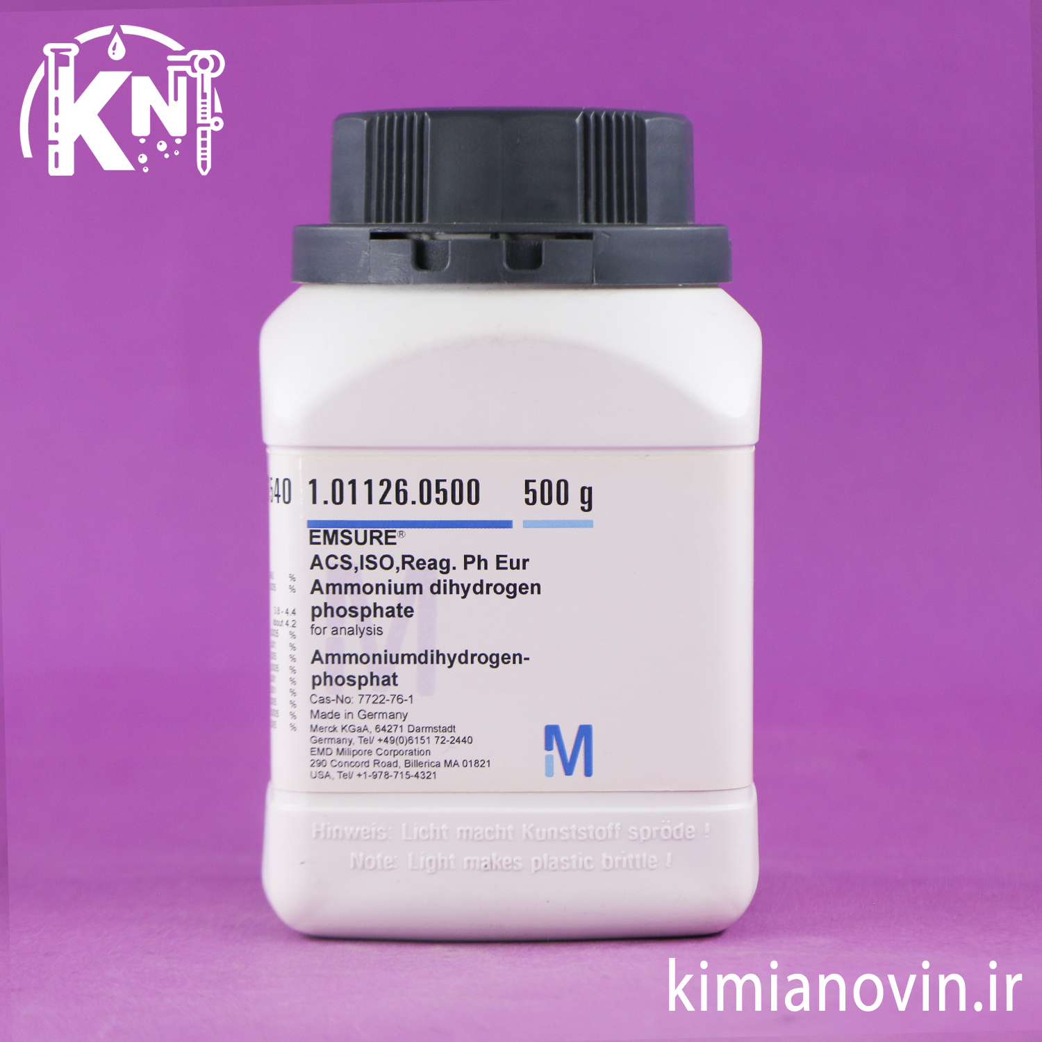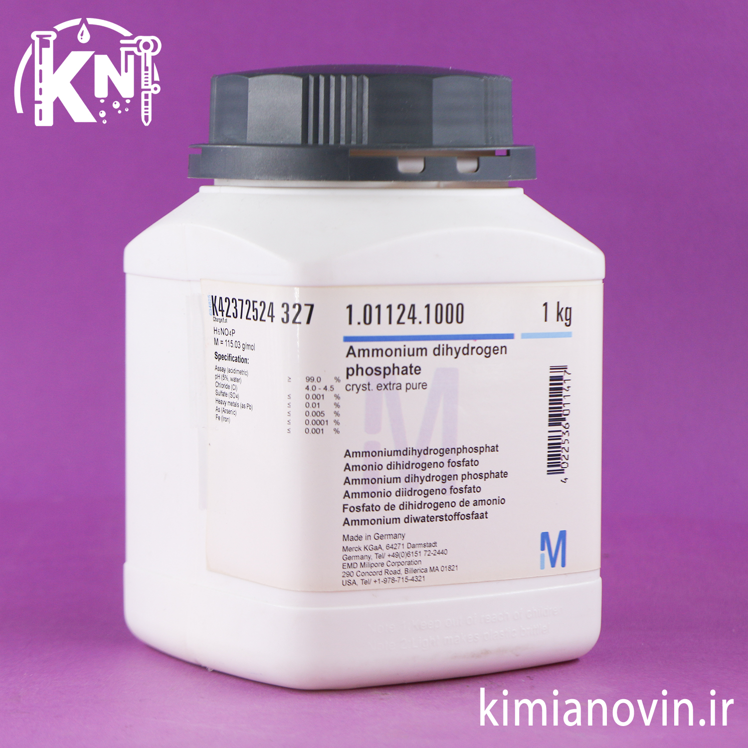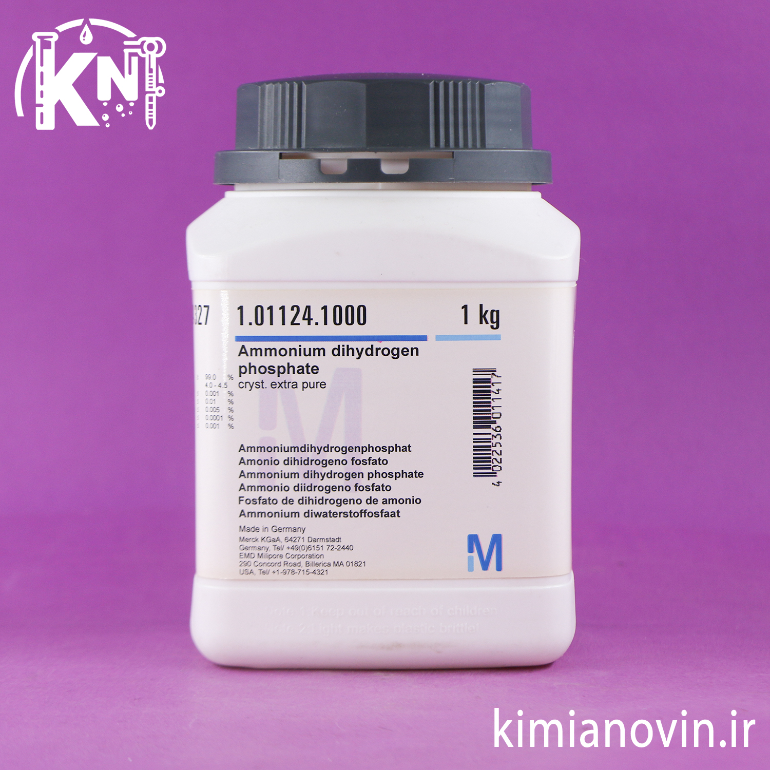 آمونیوم دی‌هیدروژن فسفات مرک یک نمک معدنی محلول در آب است که در آزمایشگاه‌ها برای تهیه بافرهای فسفاتی، تنظیم pH و انجام واکنش‌های شیمیایی استفاده می‌شود. این ماده به‌صورت پودر یا کریستال سفید عرضه شده و به دلیل خلوص بالا، مناسب کاربردهای تحقیقاتی و آموزشی است.